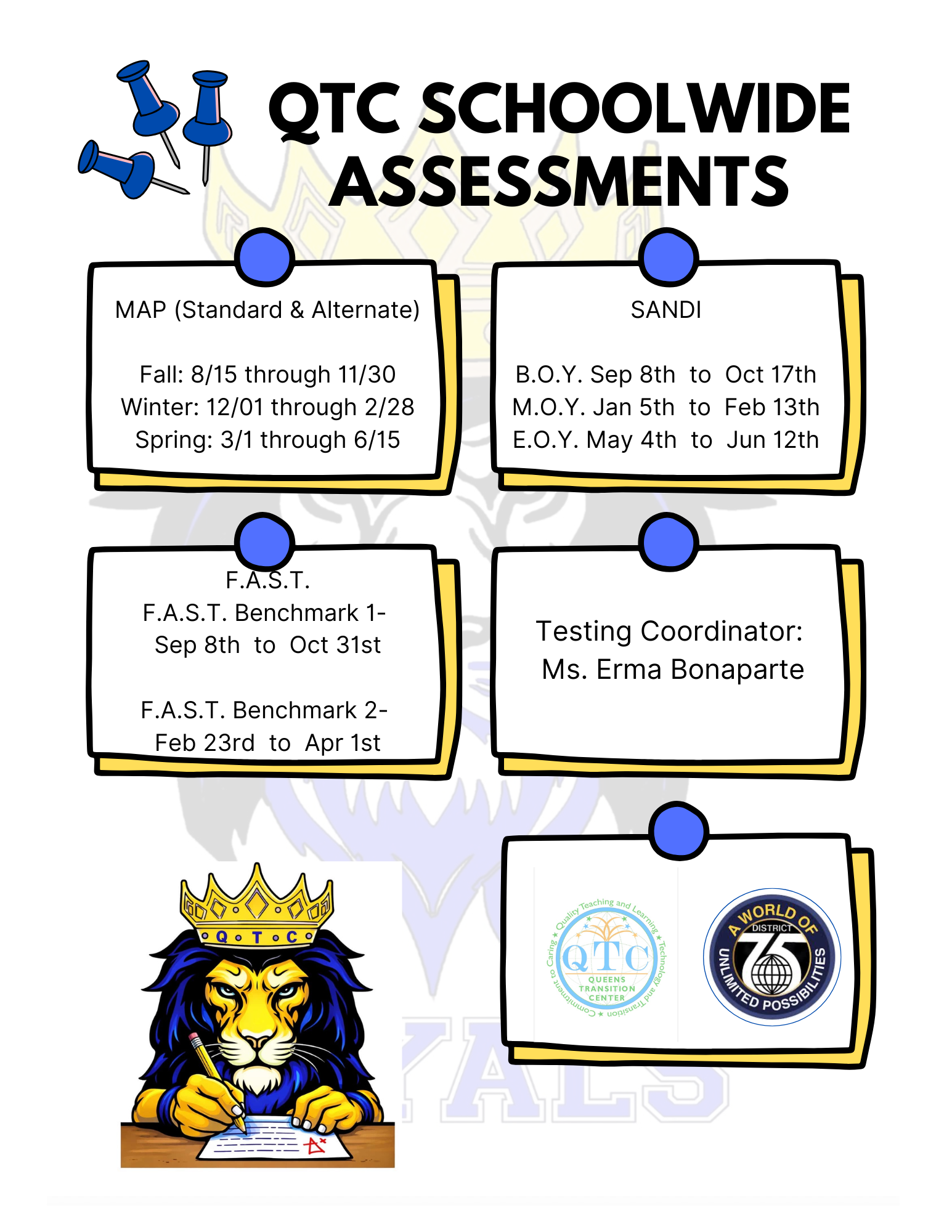 Click the links below for information about the tests your child may be required to take depending on their grade level. For a complete list of tests, including tests with rolling dates, view the full list of city, state and national tests.